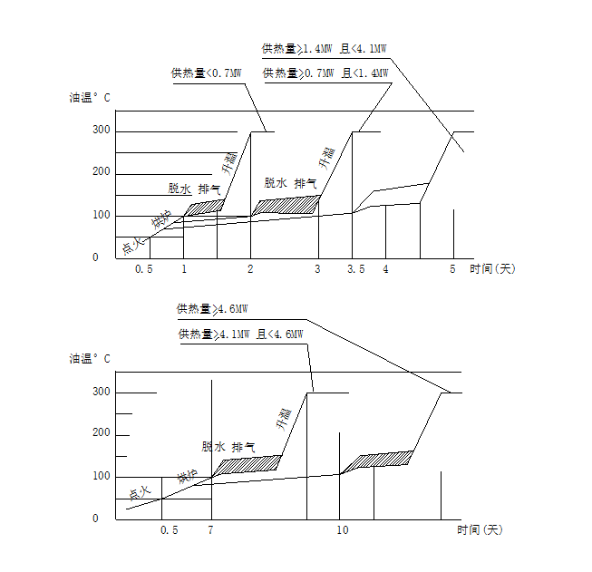 煮油過程主要是排除系統(tǒng)中的水份,水份必須在圖示溫度范圍及時(shí)間內(nèi)汽化。以確保導(dǎo)熱油中產(chǎn)生的水蒸汽不重新凝結(jié)成水。系統(tǒng)中水份積存越多煮油時(shí)間越長。煮油又能排除油中低揮發(fā)成份。當(dāng)用熱系統(tǒng)較大時(shí),應(yīng)根據(jù)實(shí)際情況,適當(dāng)增加脫水排汽時(shí)間。